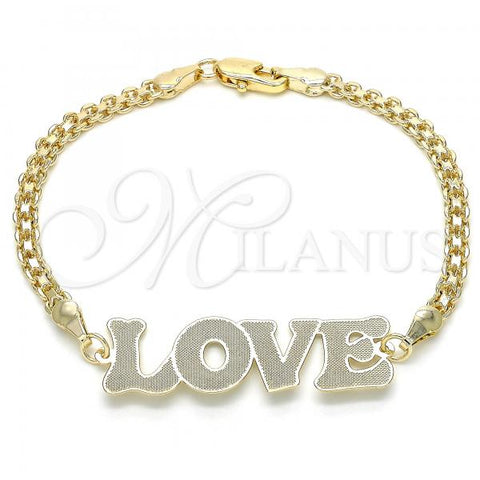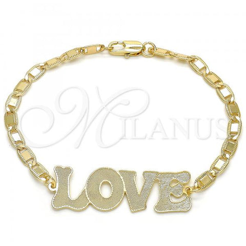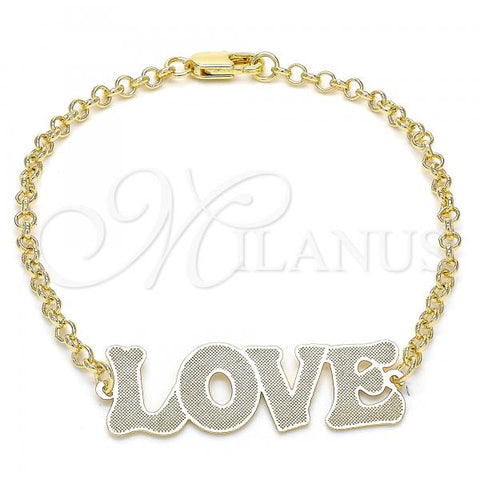 Gold Filled Fancy Bracelet. Great Bracelet for Women. Nameplate and Love Design. Polished. Weight: 4.6 g. Thickness: 04 MM Thickness.