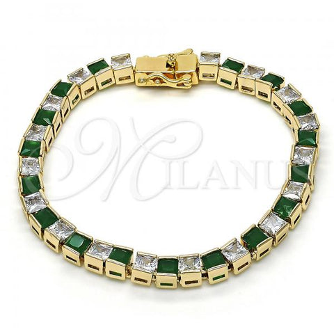 Gold Filled Tennis Bracelet. Also contains Green and White Cubic Zirconia. Great Bracelet for Women. Polished. Measures: 8.0 x 0.2 x 0.2 in Weight: 19.6 g. Thickness: 06 MM Thickness.
