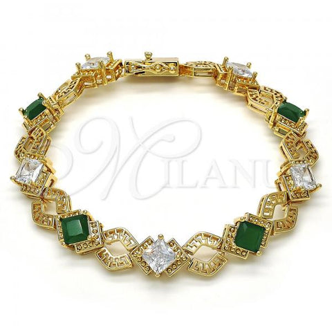 Gold Filled Tennis Bracelet. Also contains Green and White Cubic Zirconia. Great Bracelet for Women. Greek Key Design. Polished. Measures: 8.0 x 0.4 x 0.2 in Weight: 19.4 g. Thickness: 10 MM Thickness.