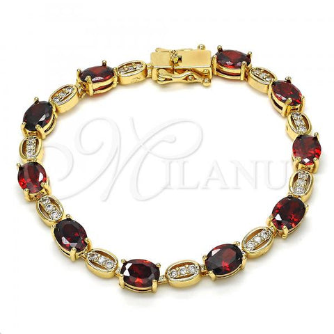 Gold Filled Tennis Bracelet. Also contains Garnet and White Cubic Zirconia. Great Bracelet for Women. Polished. Measures: 8.0 x 0.2 x 0.2 in Weight: 14.3 g. Thickness: 06 MM Thickness.