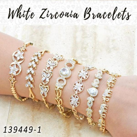 15 brazaletes de zirconia blanca en capas de oro ($6.67) c/u -Perfecto para iniciar negocios -Excelente para recargar su tienda o escaparate -Ahorre tiempo y permítanos seleccionar una variedad de productos más vendidos para usted *Se enviarán Estilos Surtidos similares a los de la imagen, no siempre iguales. *Las ventas...